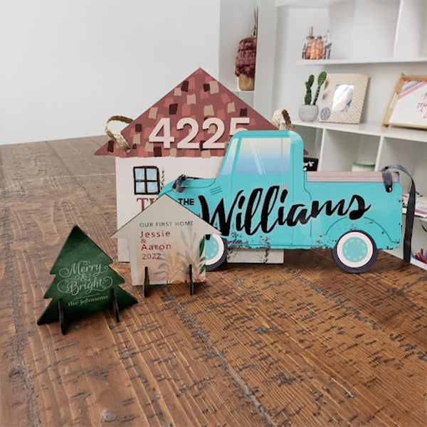 Use the same stand design used for the office nameplate to make tabletop décor. These make great gifts or placeholders for a party or reception. If you really want to impress, transform your boring front door with a vibrant personalized door sign. New homeowners will love this project.