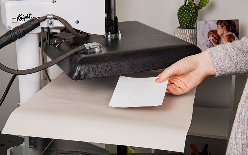 Turn on your heat press. We recommend pressing all of our products at 385°F / 195°C. Be sure to lay a piece of protective paper on the bottom of the press.
