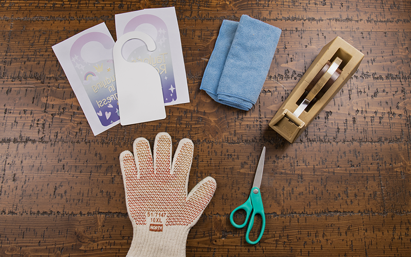 Lay the transfer down on a flat surface with the printed image facing up. Place one side of your door hanger on top of the transfer and line it up. Take two or three pieces of heat tape and secure the door hanger to the transfer.