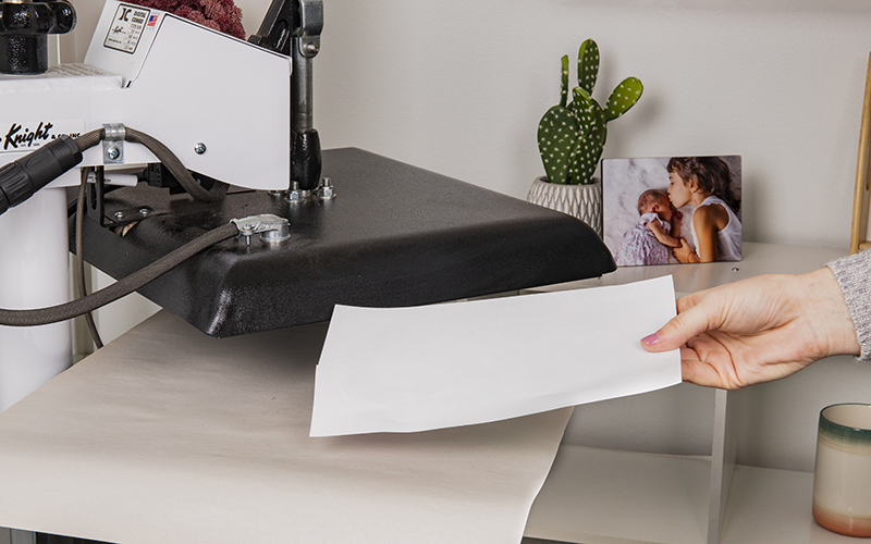 Turn on your heat press. We recommend pressing all of our products at 385°F / 195°C. Be sure to lay a piece of protective paper on the bottom of the press.