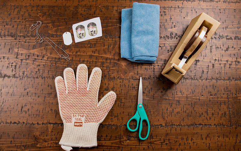 Using scissors, cut the excess white paper from around one of the transfers. Lay the transfers down on a flat surface with the printed images facing up. Pair the ID tag with one of the transfers. Take it into your hand and using your finger create a crease of the product on the transfer. Place the ID tag and transfer on top of the other transfer. You can raise the corners of the top transfer to make sure that your ID tag is covered by both transfers. Using two pieces of heat tape, tape the two transfers together to create a pouch. Try to avoid putting heat tape on the surface of the ID tag as it may cause discoloration during sublimation.