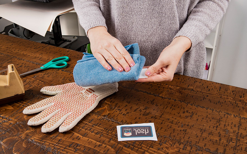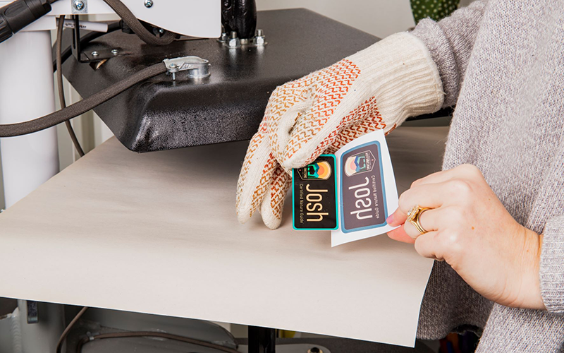 Once the timer is done use heat-protective gloves to remove the name badge from the press. Let cool.