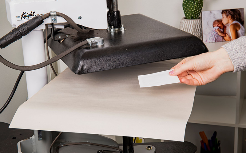 Turn on your heat press. We recommend pressing all of our products at 385°F / 195°C. Be sure to lay a piece of protective paper on the bottom of the press.