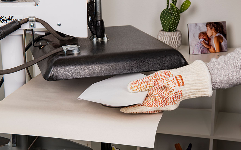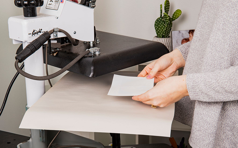 Turn on your heat press. We recommend pressing all of our products at 385°F / 195°C. Be sure to lay a piece of protective paper on the bottom of the press.