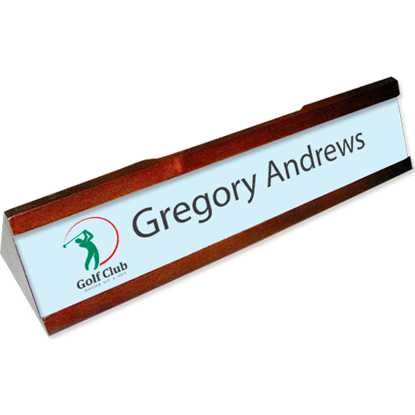 Elevate your office with this beautiful mahogany name plate holder and customizable aluminum insert. Hardwood base features slots for business cards and pens.